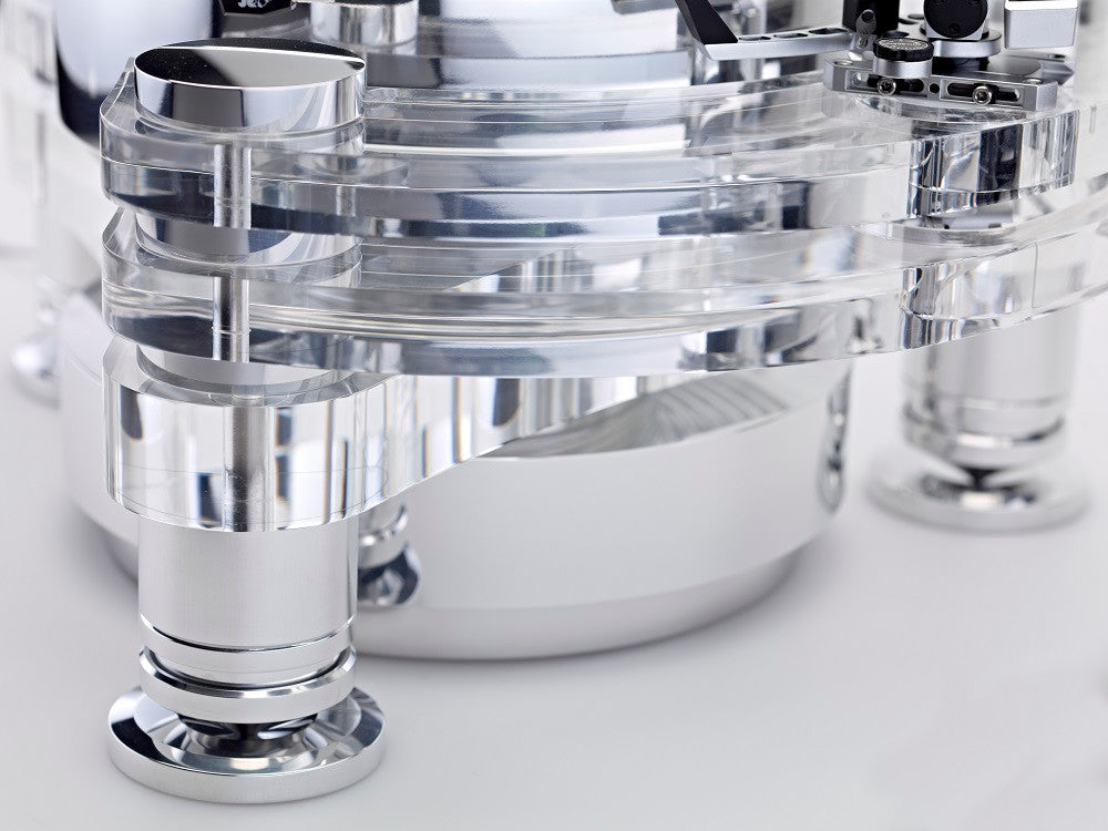 ORION SIN FONOCAPTOR Tornamesa ORION REFERENCE FMD, chassis de acrílico y aluminio pulido, con cojinete magnético FMD (Free Magnet Drive), con record clamp, brazo TRA9, sin fonocaptor, fuente de poder Konstant FMD, disponible en acrílico translúcido.