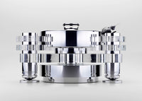 Absolutamente radical, a la vez que impresionante, en su estética esta tornamesa de referencia absoluta conecta con la mejor tradición de excelencia alemana en el campo de la ingeniería mecánica y el saber hacer único de Transrotor en el área de la reproducción de discos de vinilo. Versión mejorada de un clásico de la marca, el Orion Reference FMD tiene como principal atributo su sofisticado sistema de tracción, de tipo magnético y que responde al nombre de Free Magnetic Drive (FMD, alias “Tracción Magnética Libre”). Gracias a ello, este espectacular lector de vinilos exhibe una finura brutal en su rotación a pesar de la contundencia de las cifras que lo acompañan, caso del plato de aluminio de 80 mm de grosor y 16 kg de peso o su doble chasis.