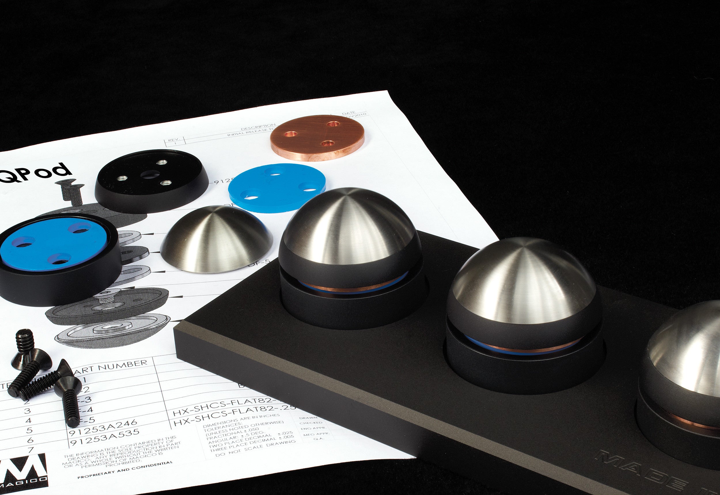 Originalmente desarrollado para I + D interno, Magmo está introduciendo los QPOD para maximizar el rendimiento del sistema frontal. Las cápsulas en sí están convertidas en CNC y se molenen de acero inoxidable endurecido, cobre sin oxígeno y aluminio de grado de avión duro anodizado con oxígeno. Estos materiales crean las capas limitantes para el material de amortiguación que se sujeta alternativamente entre para crear una sola unidad de disipación transversal, que llamamos el QPOD.